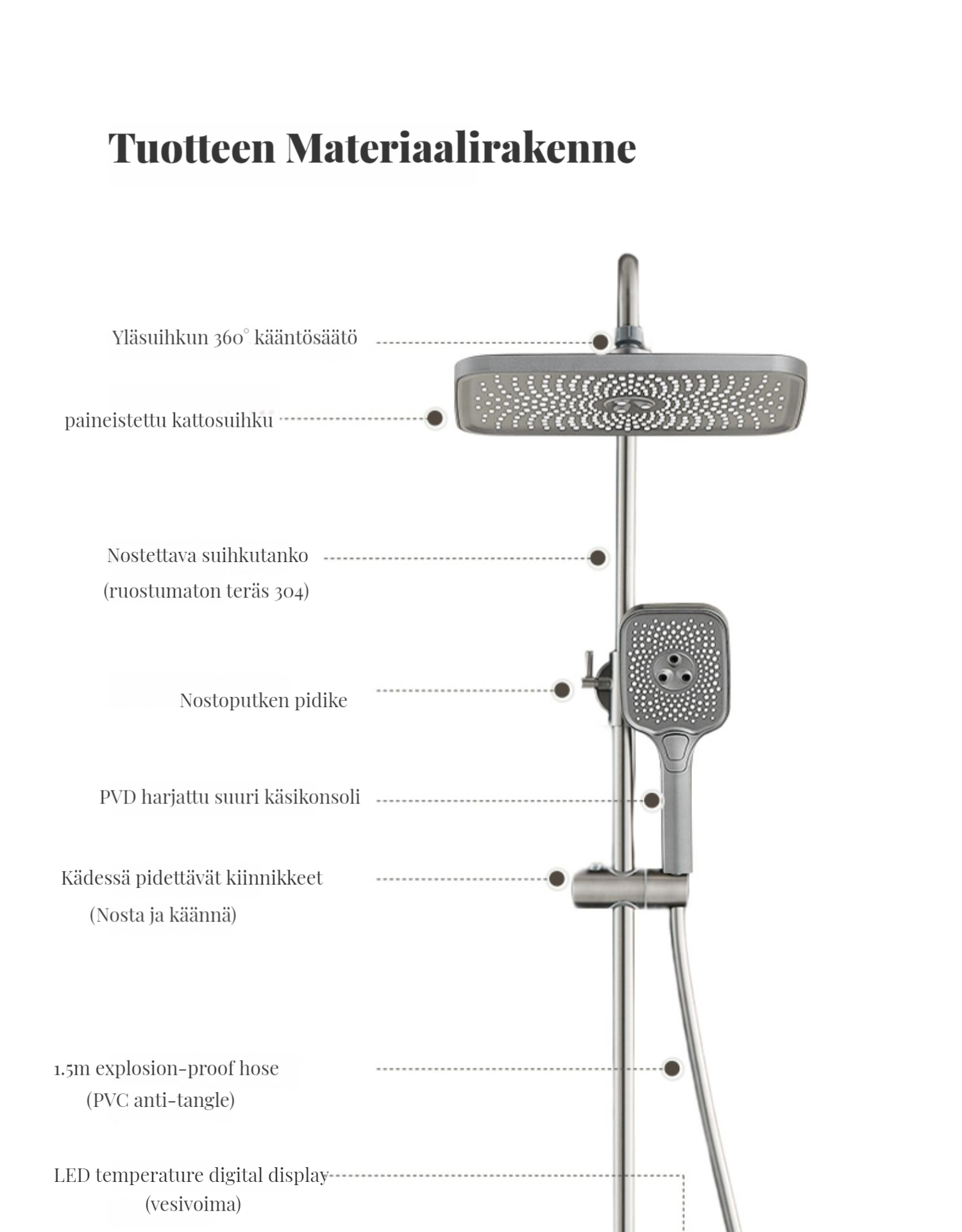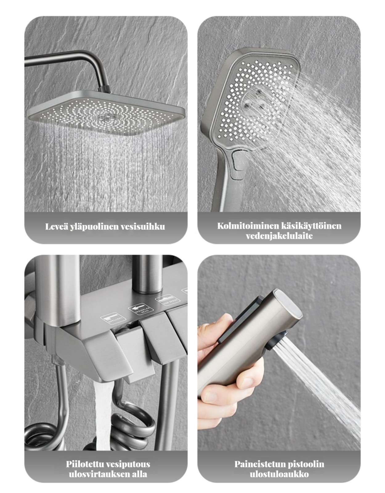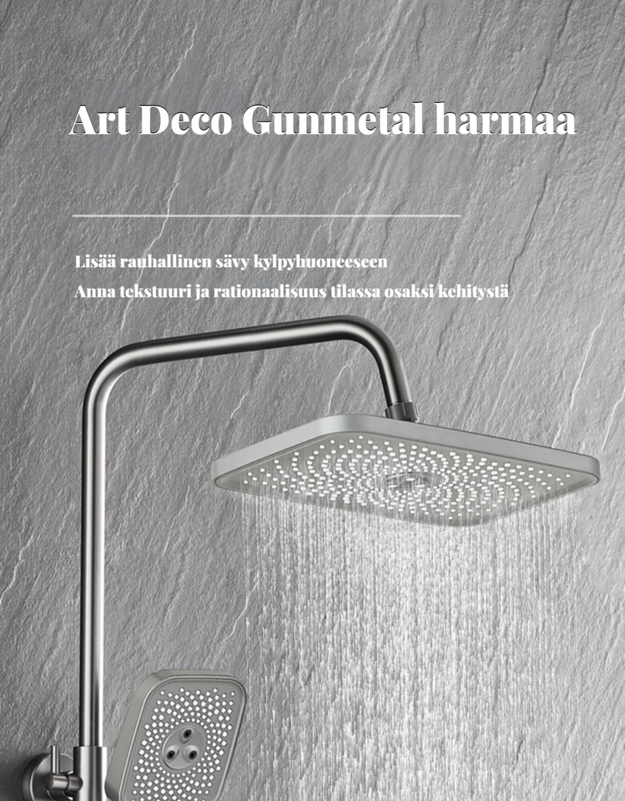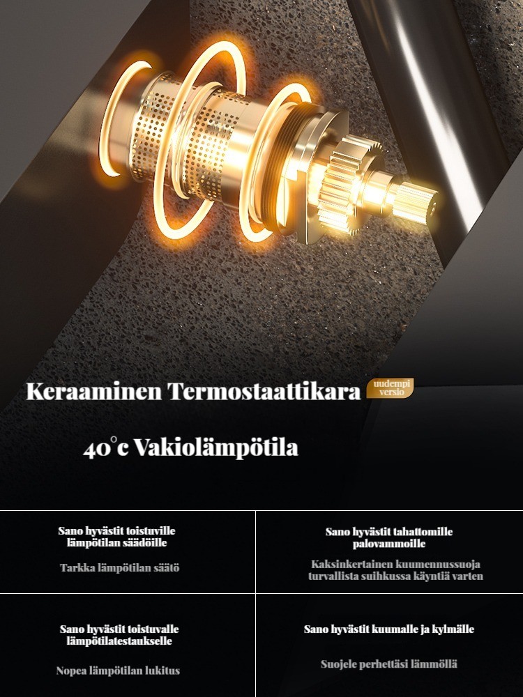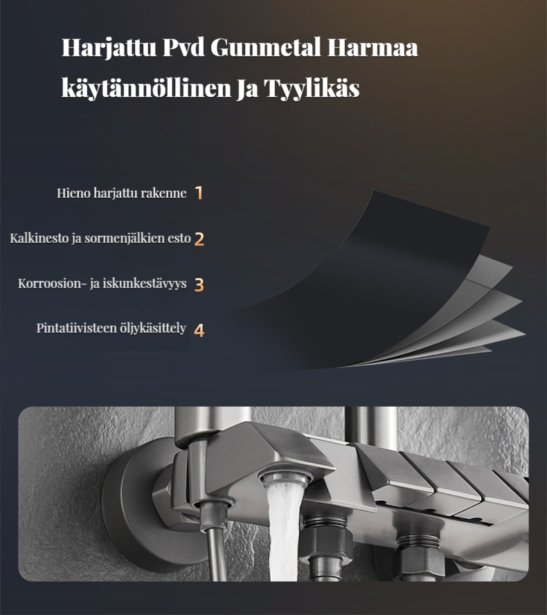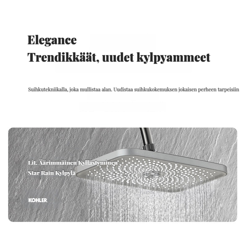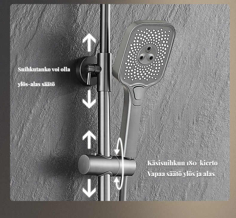 Monipuolinen suihkusysteemi:Sisältää sadekuurosuihkupään, käsikäyttöisen suihkun ja suihkumikserihanan ylelliseen ja rentouttavaan suihkukokemukseen.
