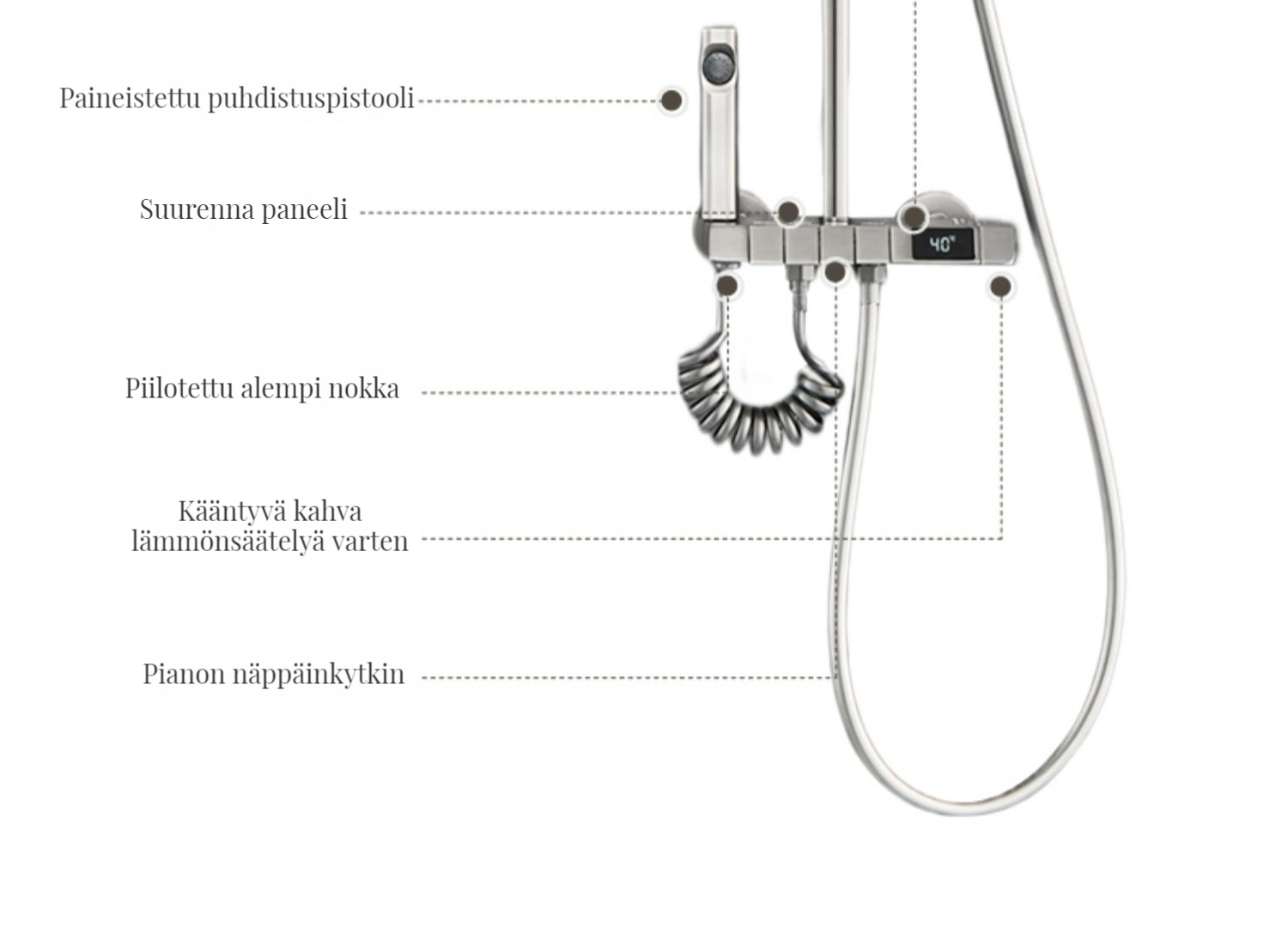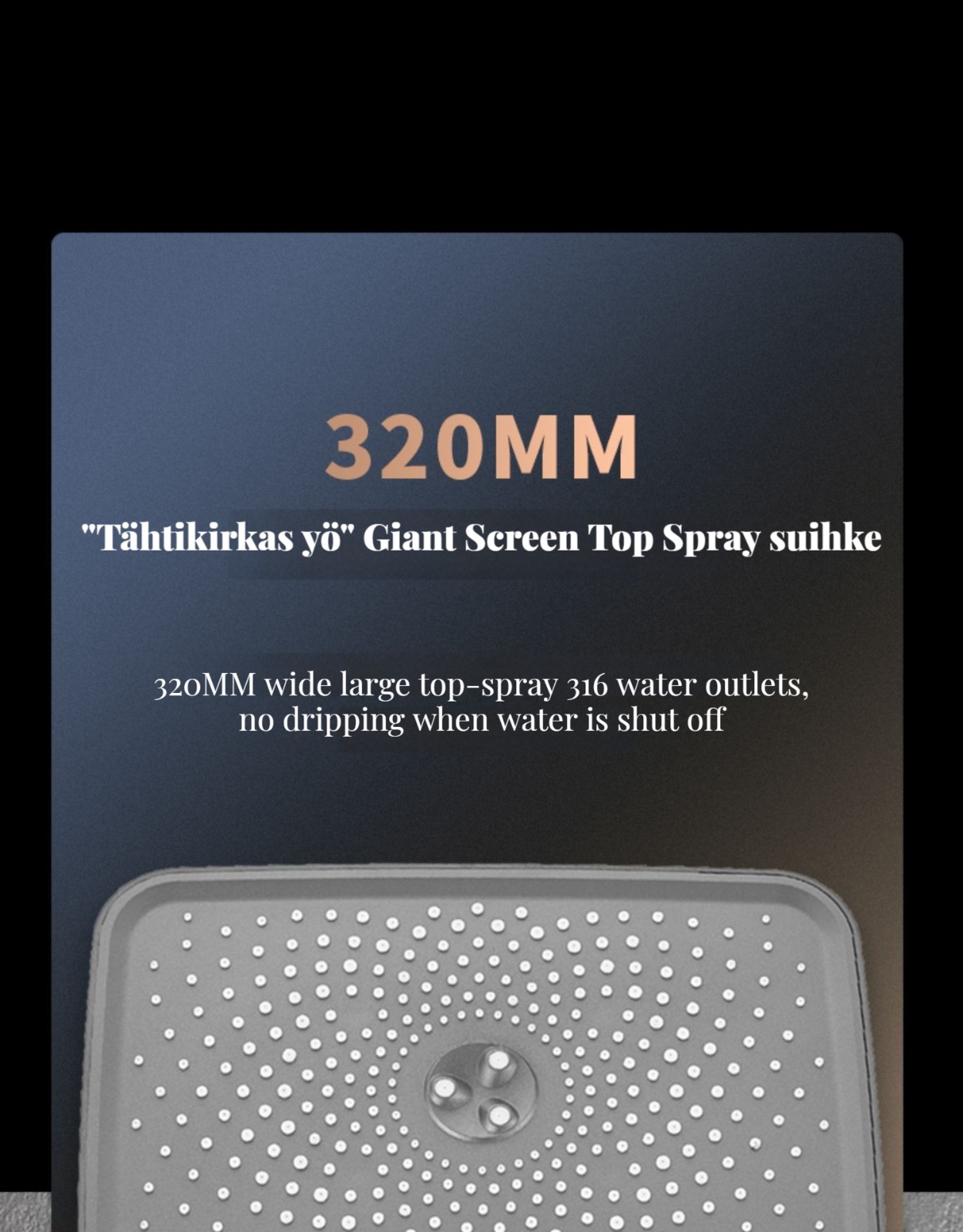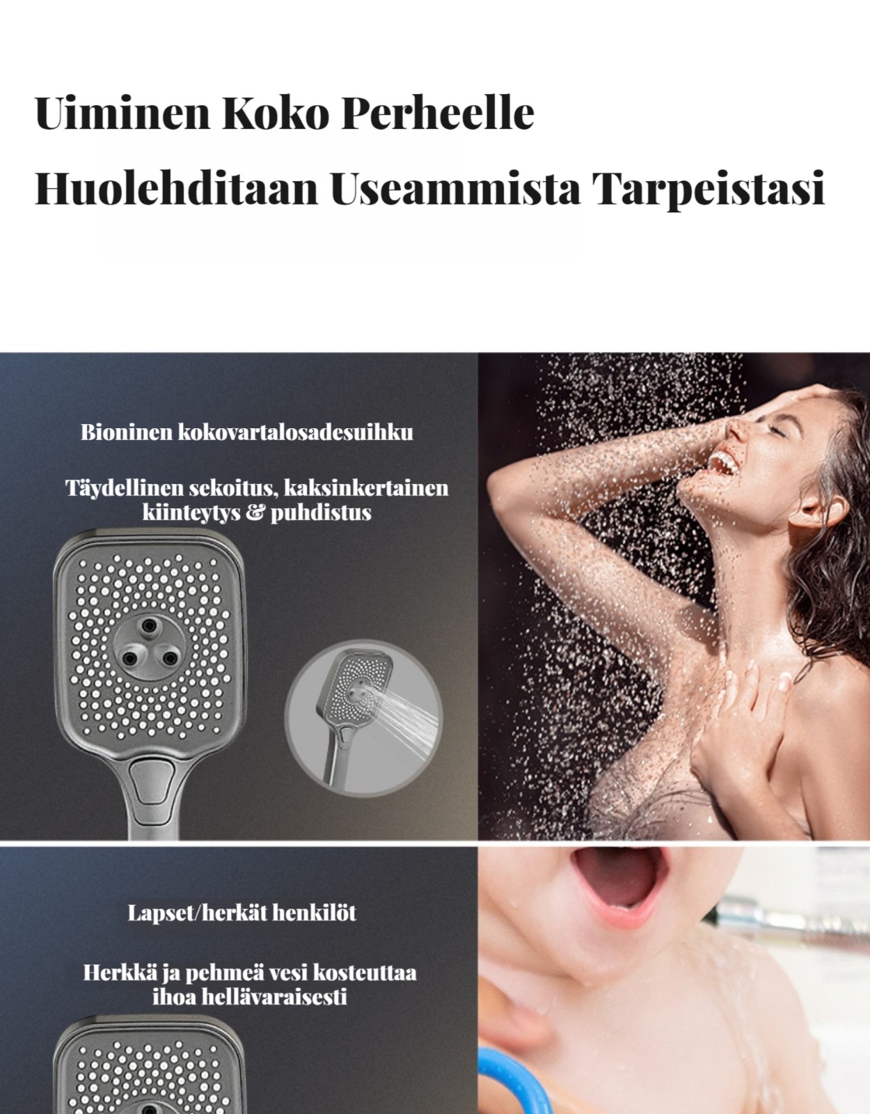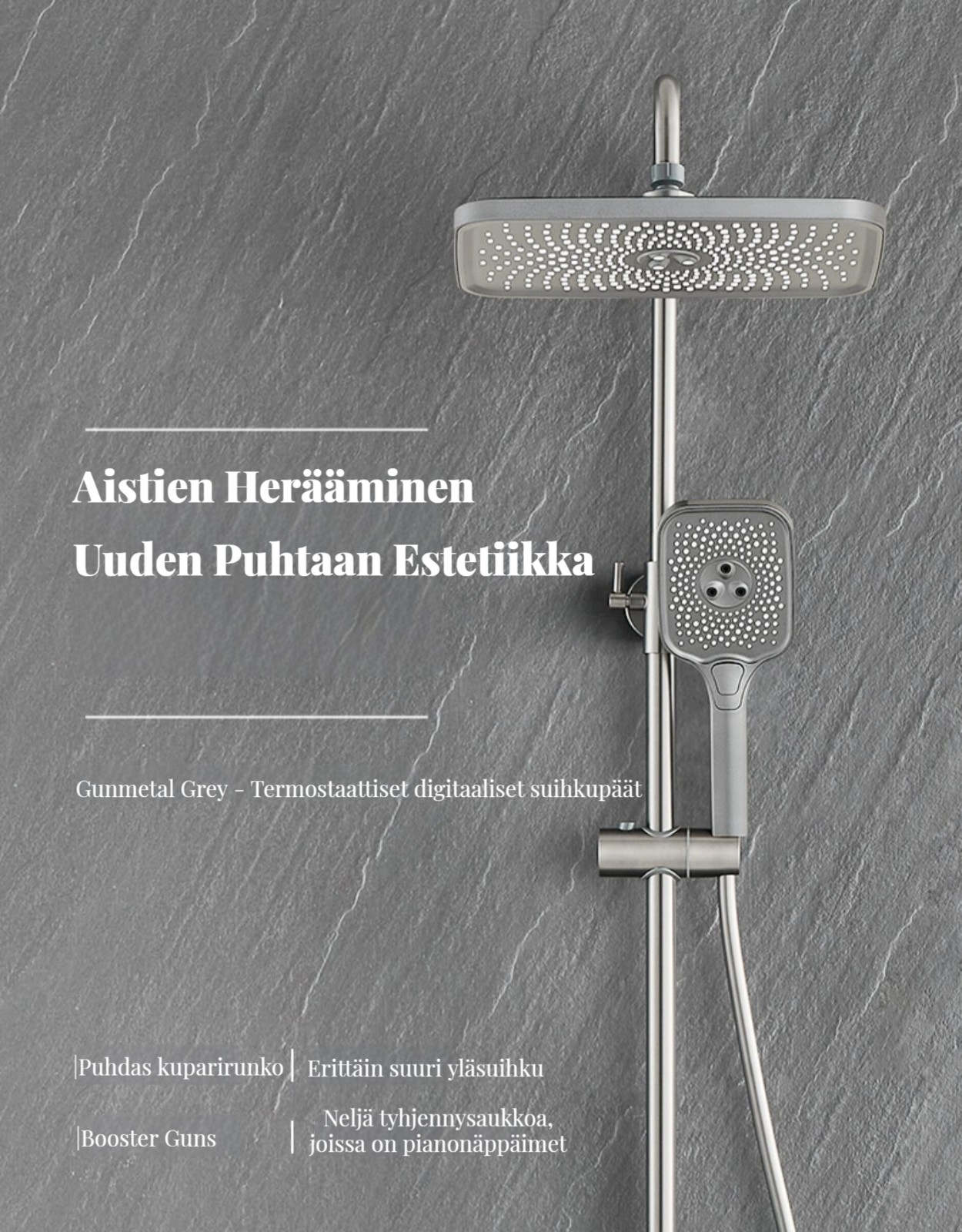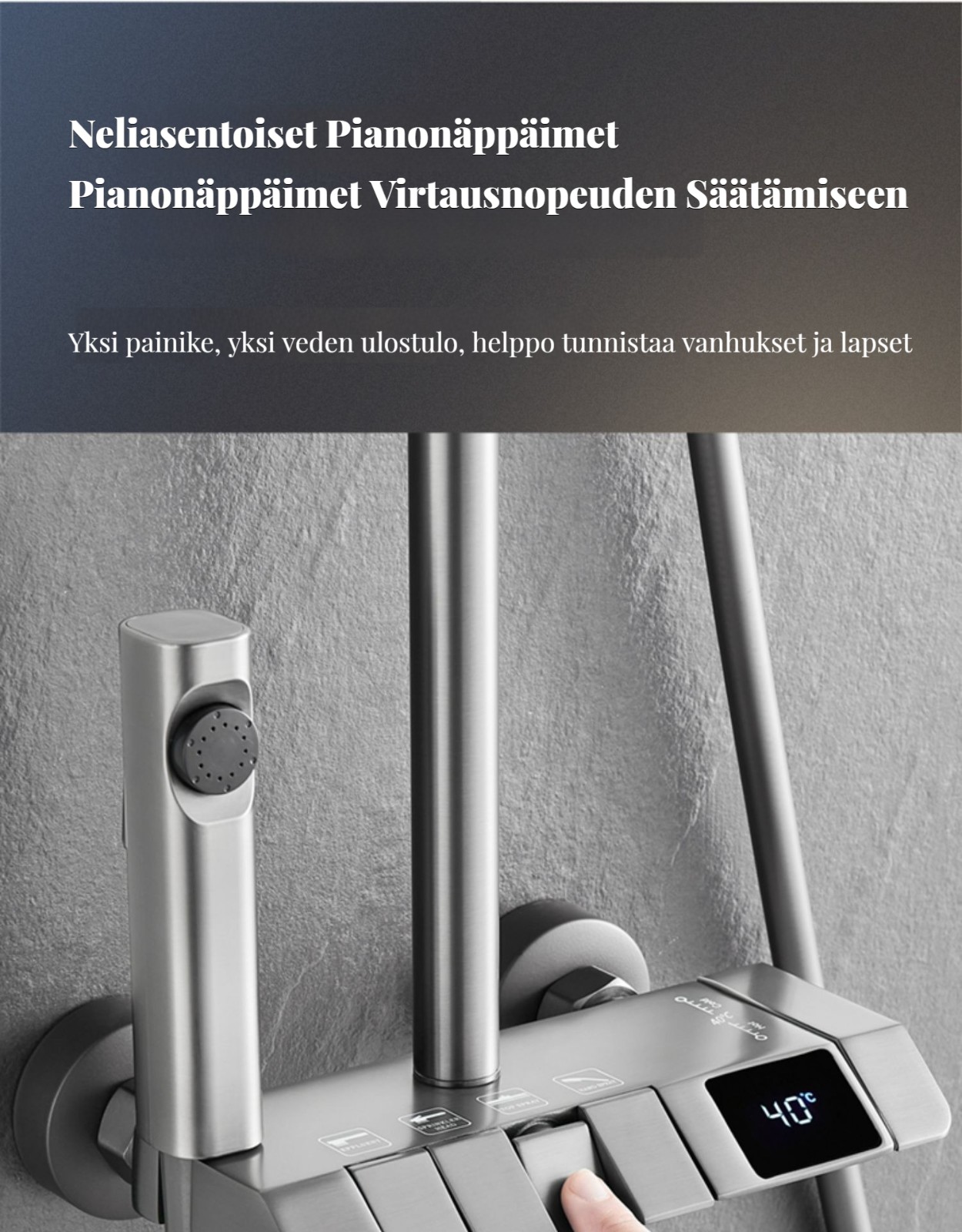 Monipuolinen suihkusysteemi:Sisältää sadekuurosuihkupään, käsikäyttöisen suihkun ja suihkumikserihanan ylelliseen ja rentouttavaan suihkukokemukseen.