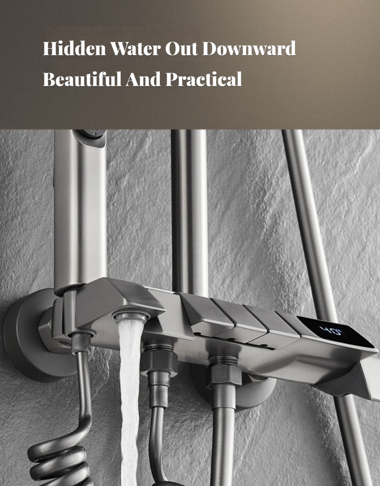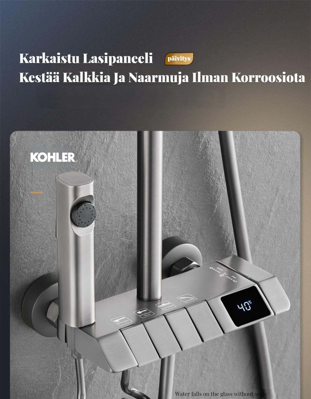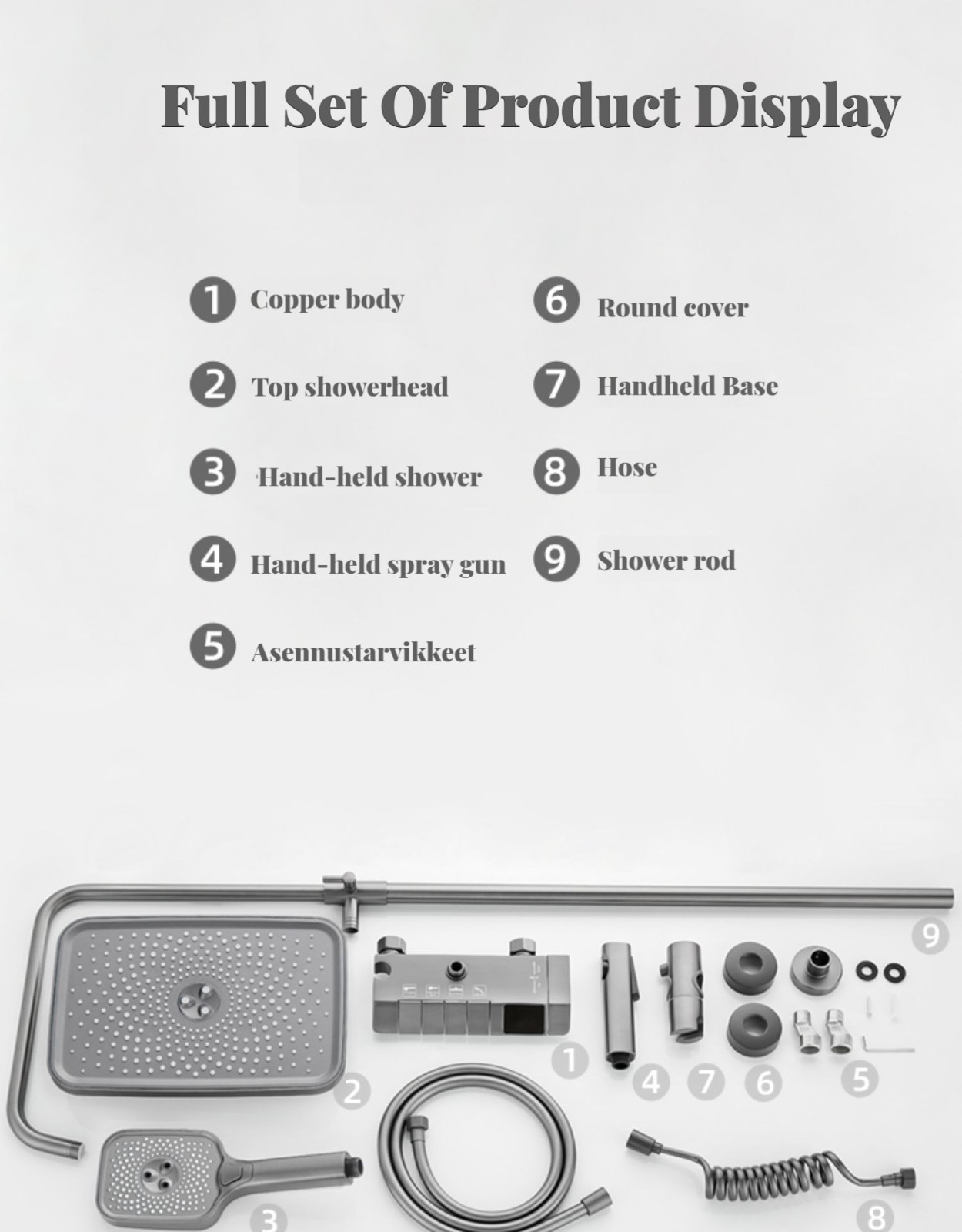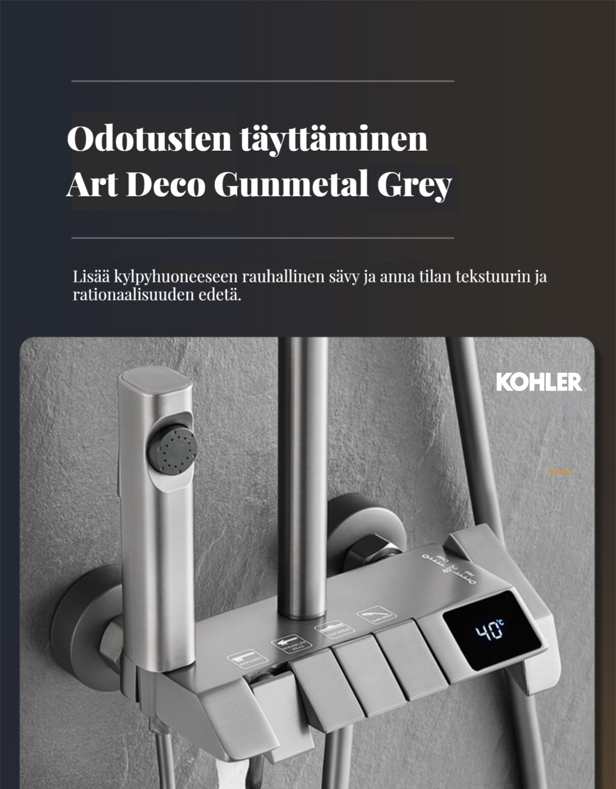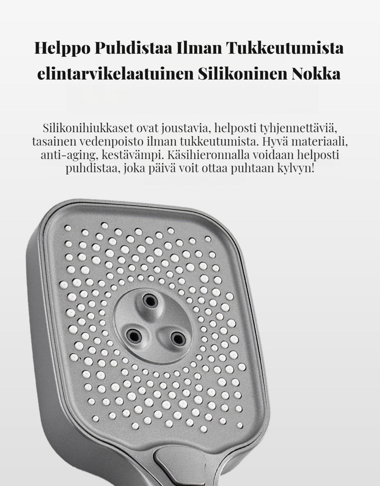 Monipuolinen suihkusysteemi:Sisältää sadekuurosuihkupään, käsikäyttöisen suihkun ja suihkumikserihanan ylelliseen ja rentouttavaan suihkukokemukseen.